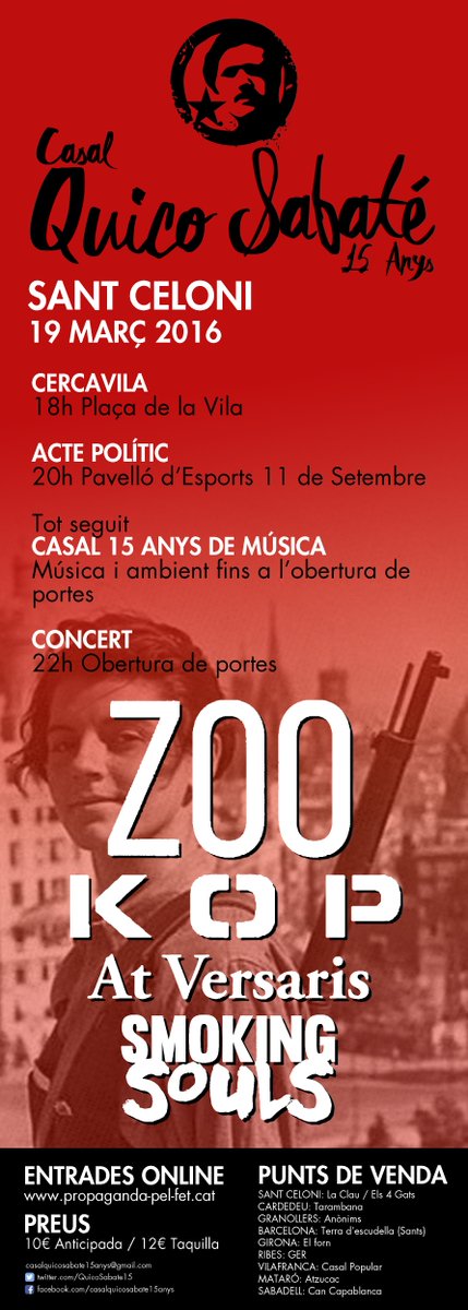 Aquest dissabte hi ha cita ineludible a Sant Celoni. Els amics del Casal Quico Sabaté de Sant Celoni celebren XV anys i la jornada d’actes es clourà amb un concert que presenta un cartell de festival: Smoking Souls, ZOO, KOP i At Versaris junts per a l’ocasió! A Propaganda pel fet! us ho volem posar fàcil i tenim en marxa dos sortejos per aconseguir 2 entrades dobles per la cara via facebook i twitter. Aquí teniu les informacions. Participeu i molta sort a tothom!