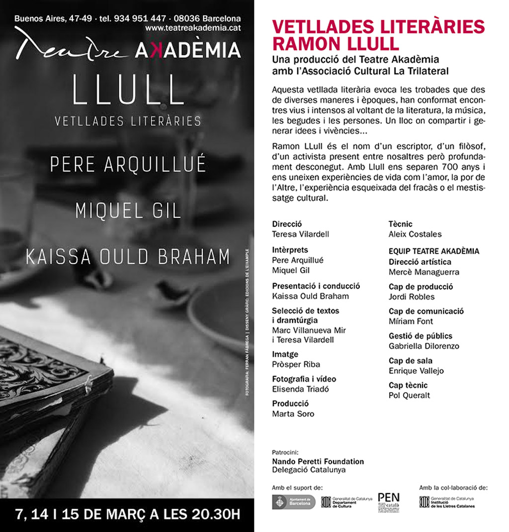 Miquel Gil encetà avui tres passis al Teatre Akadèmia acompanyat de Pere Arquillué i en memòria de Ramon Llull. Les Vetllades Literàries Ramon Llull són una producció del Teatre Akadèmia i l’Associació Cultural La Trilateral que evoquen les trobades que des de diverses maneres i èpoques han conformat encontres vius i intensos al voltant de la literatura, la música, les begudes i les persones. Un lloc on compartir i generar idees i vivències...