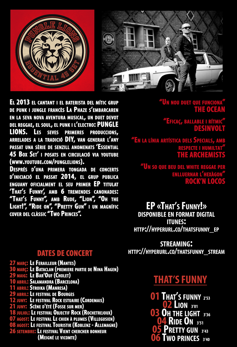 El 2013 el cantant i el baterista del mític grup de punk i jungle francès La Phaze s'embarcaren en la seva nova aventura musical, un duet devot del reggae, el soul, el punk i l'electro: PUNGLE LIONS. Les seves primeres produccions, arrelades a la tradició DIY, van generar l'any passat una sèrie de senzill anomenats 'Essential 45 Box Set' i posats en circulació via youtube. Després d'una primera tongada de concerts d'iniciació el passat 2014, el grup publica enguany oficialment el seu primer EP titulat 'That's Funny', amb 6 tremendes canonades: "That's Funny", amb Rude, "Lion", "Oh the Light!", "Ride on", "Pretty Gun" i un magnífic cover del clàssic "Two Princes".
