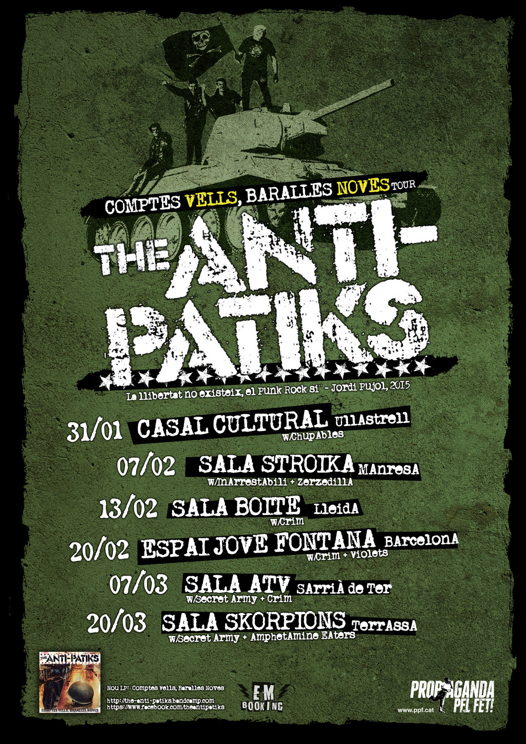 The Anti-Patiks començaran a girar el nou espectacle i el nou disc el proper dissabte 31 de gener a casa, a Ullastrell, en una vetllada que promet tot el descontrol que se li preveu i una mica més. Les primeres dates confirmades portaran a The Anti-Patiks i els comptes vells i les baralles noves a Manresa, Lleida, Barna, Sarrià de Ter i Terrassa!