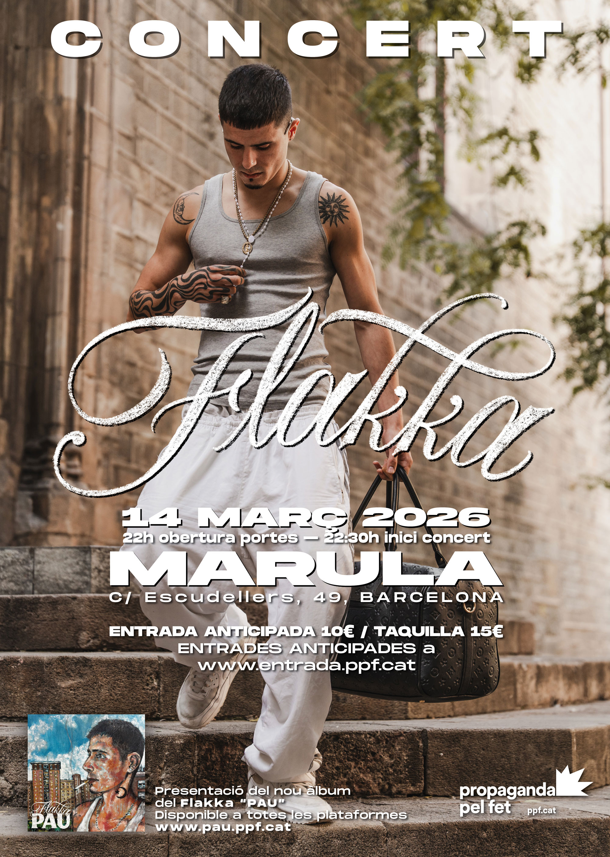 Des del barri de Sants, a Barcelona, Flakka ha fet de la seva veu i del carrer la seva bandera. El projecte neix entre places i cantonades, amb el rap com a llenguatge i la rumba com a vehicle per convertir vivències quotidianes en cançons amb ànima i ritme. Després d’una primera etapa marcada per singles que han anat definint el seu univers —entre l’orgànic i el digital, entre la tradició rumbera i l’actitud rapera forjada a l’escena del carrer—, arriba 'PAU', el seu debut discogràfic. Produït per MLR Sound, el disc reuneix 11 cançons i compta amb les col·laboracions de Franky Brownz, Davile 930 i Dirty Porko, reforçant el seu pont entre escenes. 'PAU' una carta de presentació en majúscules: personalitat, emoció i una facilitat innata per facturar hits que creuen rumba i rap en un obrir i tancar d’ulls. Amb aquest àlbum debut la rumba de Barcelona del segle XXI sona contemporània i ambiciosa, amb barres afilades i palmes que miren al futur sense oblidar d’on vénen.